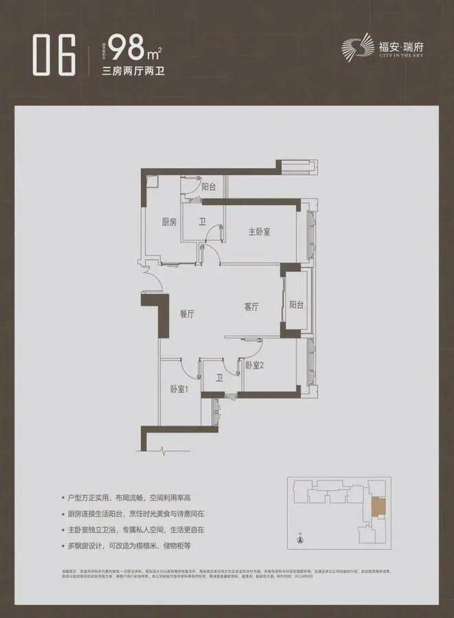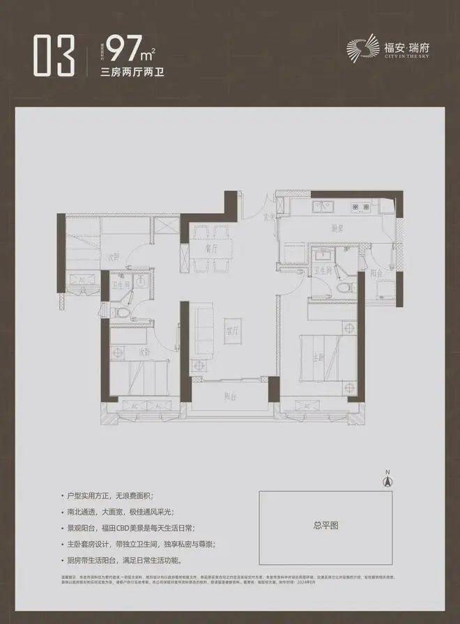 主推建面约97-98-112-126-143㎡的3-4房产品,户型均设计有双阳台、双套房。