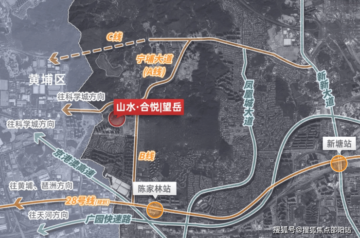 如果选择地铁出行,有规划中的28号线的陈家林路站,距离项目大概只有900米左右,目前规划站点在合生湖山国际那边,但还是存在一定的不确定性,地铁建好开通以后,坐地铁去天河、海珠、黄埔等区也非常方便。