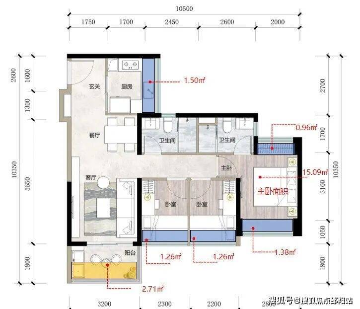 建面约88㎡户型,额外可使用面积合计约13.04㎡:飘窗部分额外可使用面积约10.32㎡,阳台部分额外可使用面积约2.72㎡