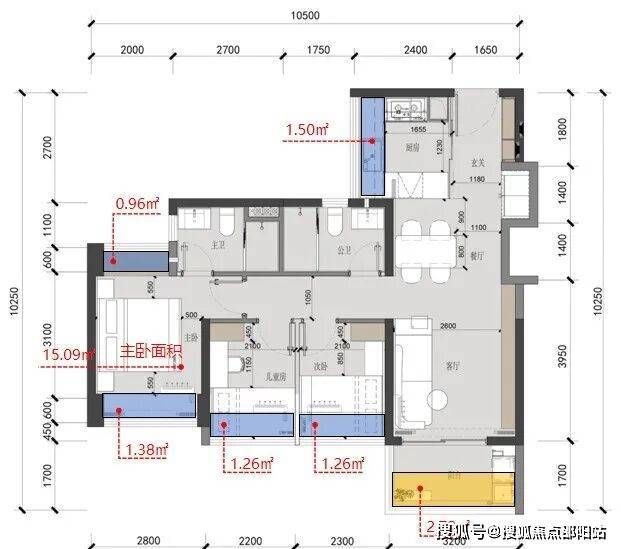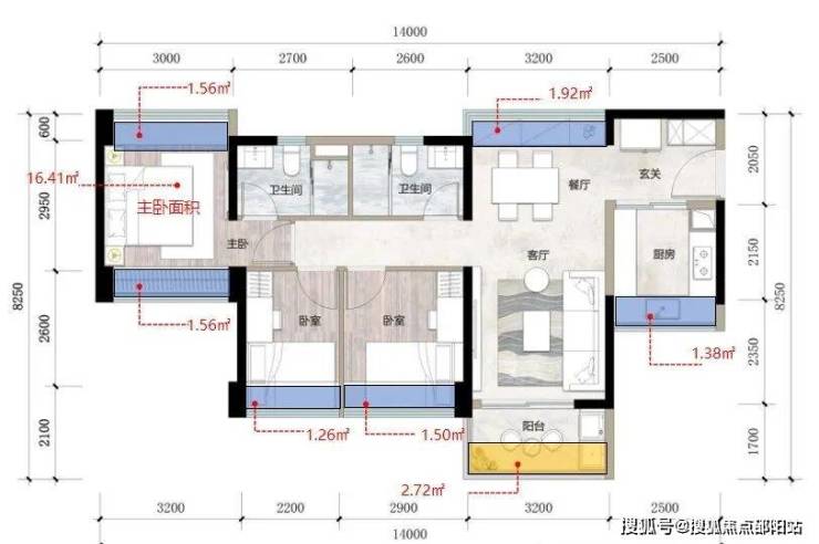 建面约81㎡户型,额外可使用面积合计约9.86㎡:飘窗部分额外可使用面积约7.14㎡,阳台部分额外可使用面积约2.72㎡