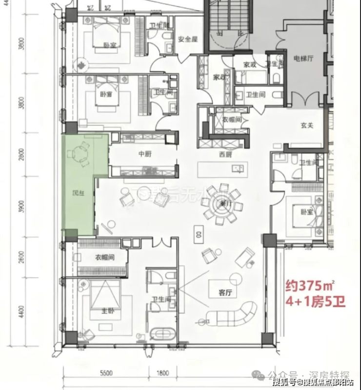 · 370-375㎡户型: 4+1房五卫设计,配备家庭厅和家政套间,适合有多样化生活需求的高净值家庭。