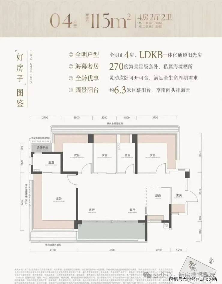 115㎡的4房2厅2卫,设计的是横厅南北通透格局,进门可做800库玄关,客餐厅6.3米开间,LDKB一体化,五开间朝南,分别做到了主卧21.52㎡/次卧13.69㎡/次卧11.88㎡/次卧8.14㎡(包含墙体飘窗),U型厨房,主卧卫生间带1个设备平台约1.71㎡,得房率约81.4%(不含赠送),客厅连接餐厅出6.3米长的大阳台约11.34㎡,西南朝向。 套内面积93.98㎡+飘窗20.63㎡+阳台5.67㎡+设备平台1.71㎡=实得面积121.99㎡,加上赠送后得房率约105.6%。