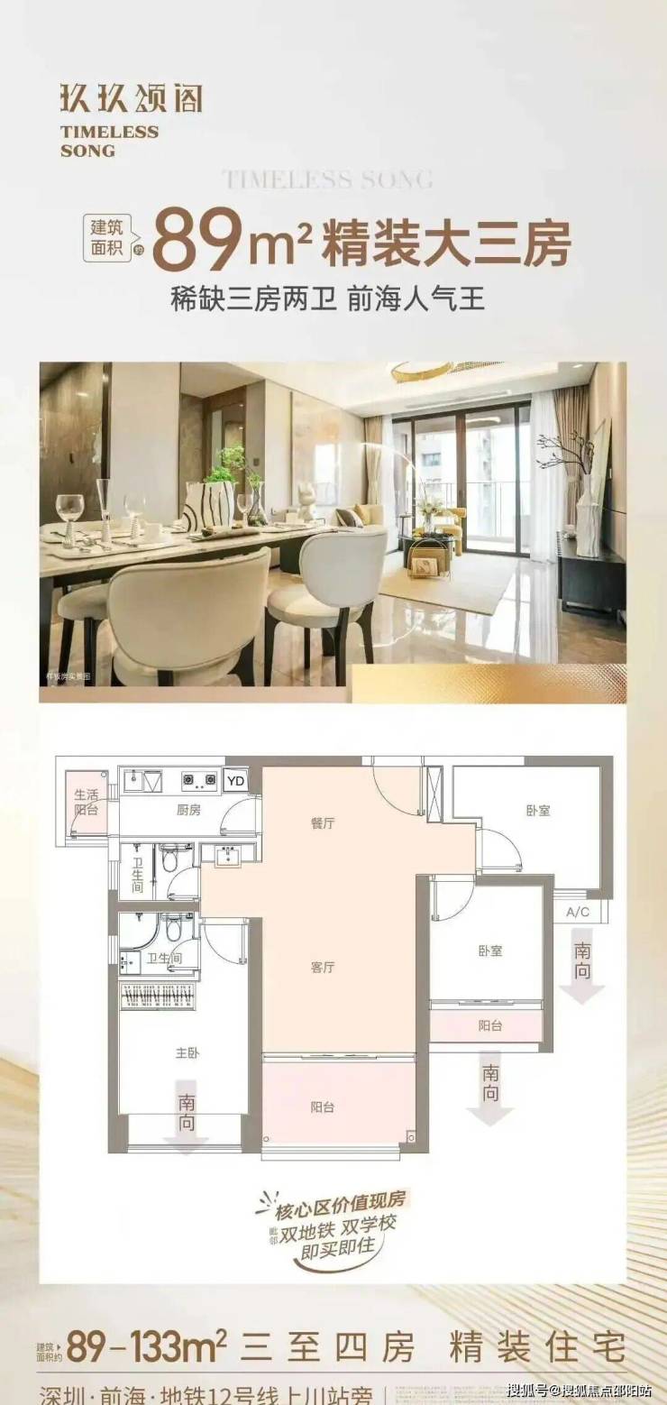 三阳台:前海黄金圈内,唯一在售89㎡三房两卫三阳台,客厅阳台进深2米,堪比140㎡大户型阳台