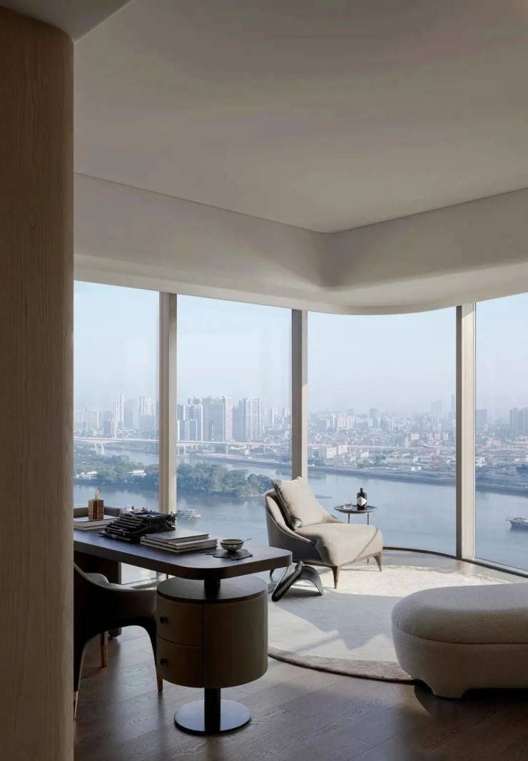 临江面采用大面积落地玻璃窗,环幕江景,270°立面转角全景落地窗,犹如海上行宫床头舱,江景视觉比客厅更佳。据闻,为了保持玻璃和石材的弧度,营造零瑕疵的天幕视野,不惜成本造价,耗费足足4个月的时间才完成安装。