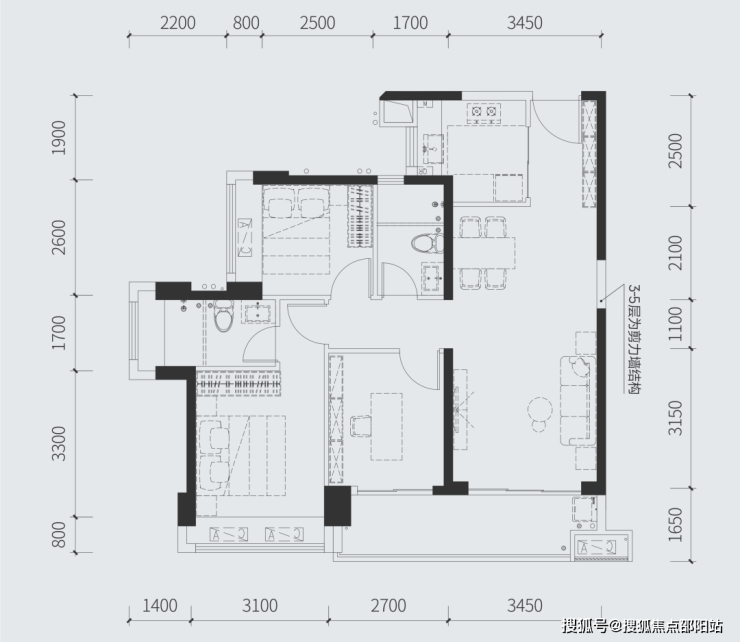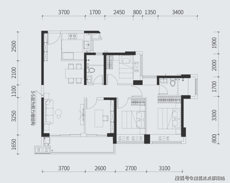 建面约97㎡三房两厅两卫,双开间阳台设计 瞰四季阳光美景,U形厨房格局 烹饪动线流畅高效