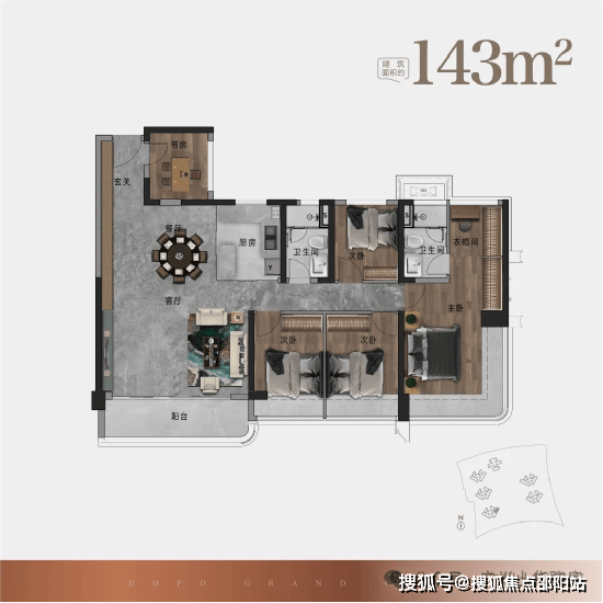 143㎡户型,南向宽景4开间设计 | 约36.5M环幕采光面 | 270°环幕瞰景主卧|多元化功能阳台
