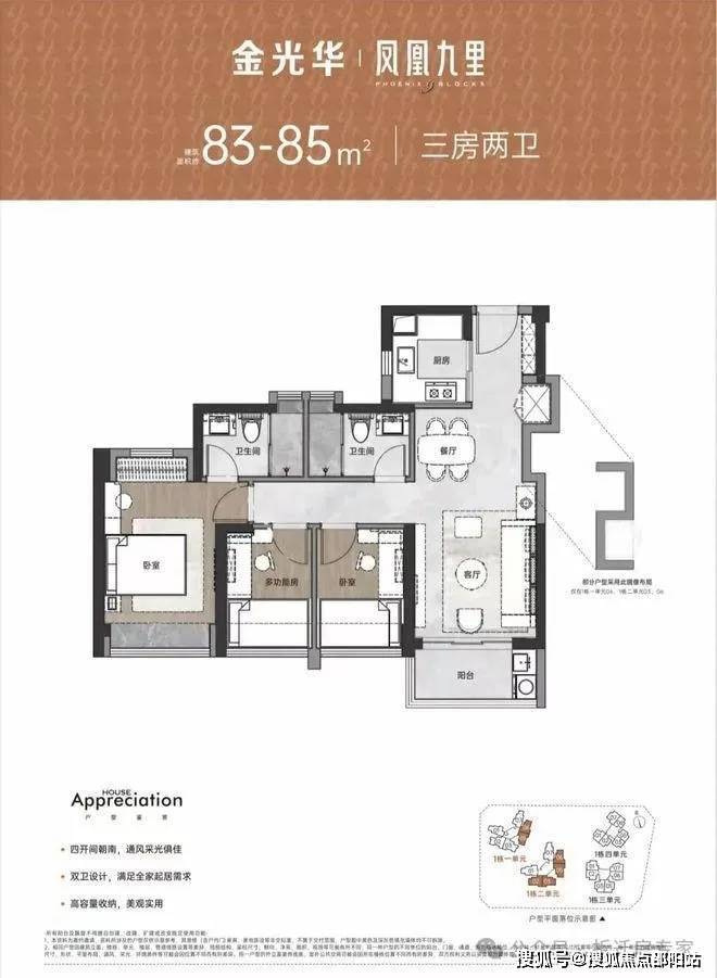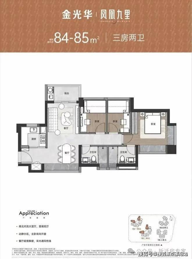 85㎡的3房2厅2卫(01.07户型),设计的是竖厅南北通透格局,主卧双飘窗设计,U型厨房,客厅阳台主朝西北、东北向。