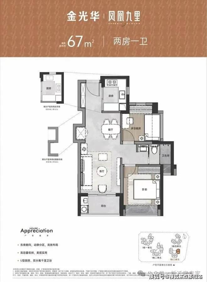67㎡的2房2厅1卫,设计的是竖厅格局,S墙设计预留冰箱位,U型厨房,卫生间三段式分离设计,东南朝向。