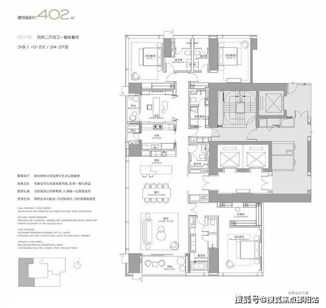 T3栋低区(3-37层),三房四卫+家政套间,横厅设计,空间开阔。三间卧室均为套房,主卧双面采光。在房间数与空间尺度间取得平衡;主卧及客厅享有朝向湿地公园的优异景观层次。