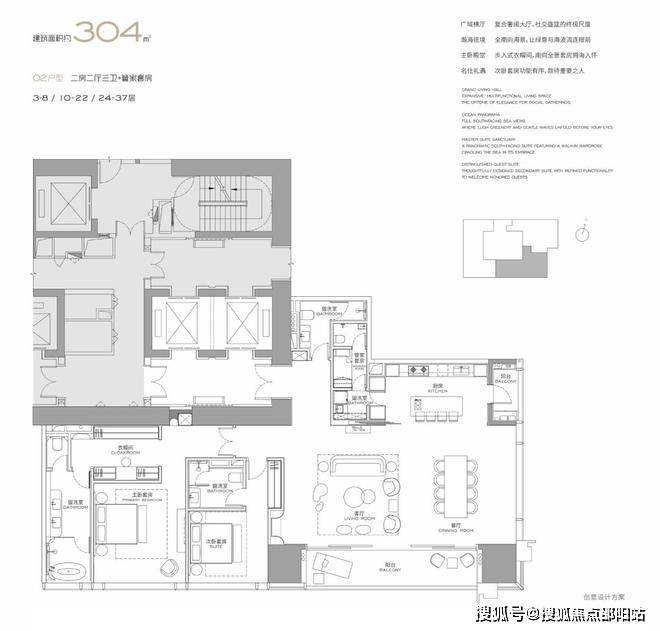 T3栋中低区(3-37层),两房三卫+家政套间,LDK一体化横厅,动静分区彻底。双卧室均为套房,主卧配备步入式衣帽间。拥有最佳观海方位,动区空间尺度感突出,主卧采光与景观俱佳。仅设两房,功能纯粹;公卫为暗卫;家政动线未完全独立。