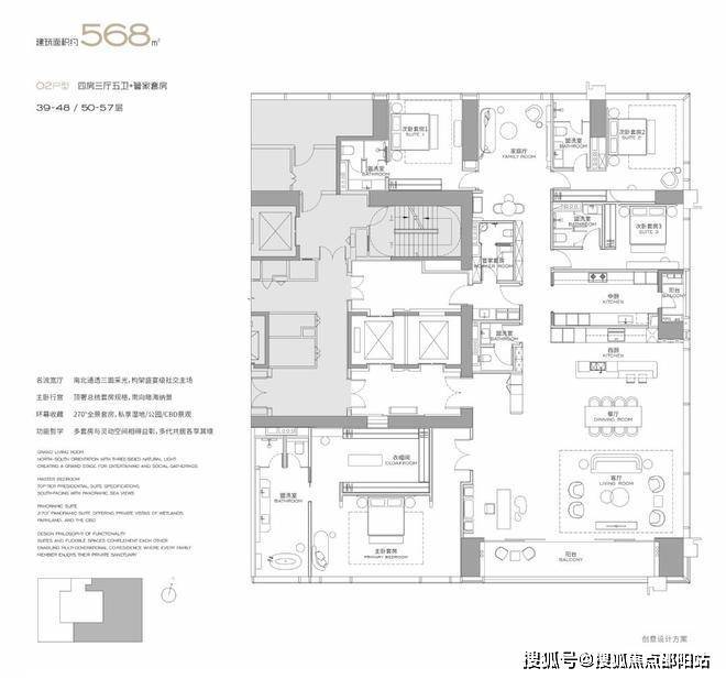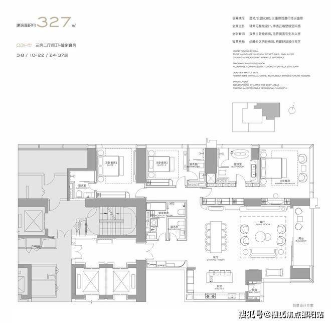 T3栋(3-57层),四房四卫+家政套间。中西厨分区,餐客西厨一体,带多功能房。端头位置,三面采光。功能完备,房间数充足;实现了主仆双动线;会客观景视野一流。