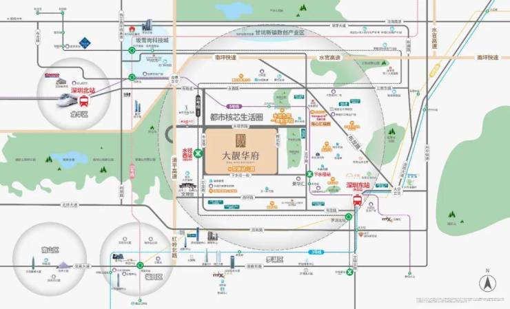 交通配套:大靓华府紧邻清平高速入口(500米),自驾30分钟可达福田;现有地铁5号线“下水径站”距离约1.5公里,需公交接驳;1公里内有10个公交站,覆盖5条地铁线(含3、14、10号线换乘),地铁25号线(规划中)设“水径西站”距项目仅200米,建成后可串联坂田科技城,但建设周期未定。