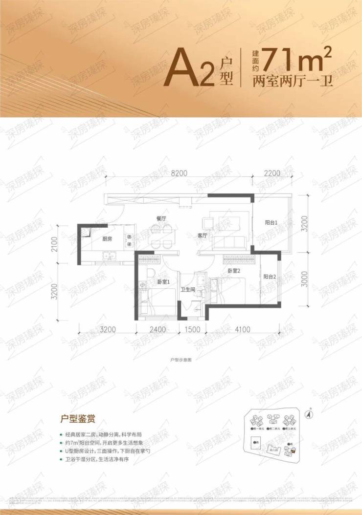 71㎡的2房2厅1卫,设计的是竖厅格局,客厅3.2米开间,进深8.2米,LDKB一体化设计,2个卧室分别做到了主卧12.5㎡/次卧9.12㎡(包含墙体飘窗),U型厨房,卫生间干湿分离,得房率约88%(包含赠送),东南朝向.