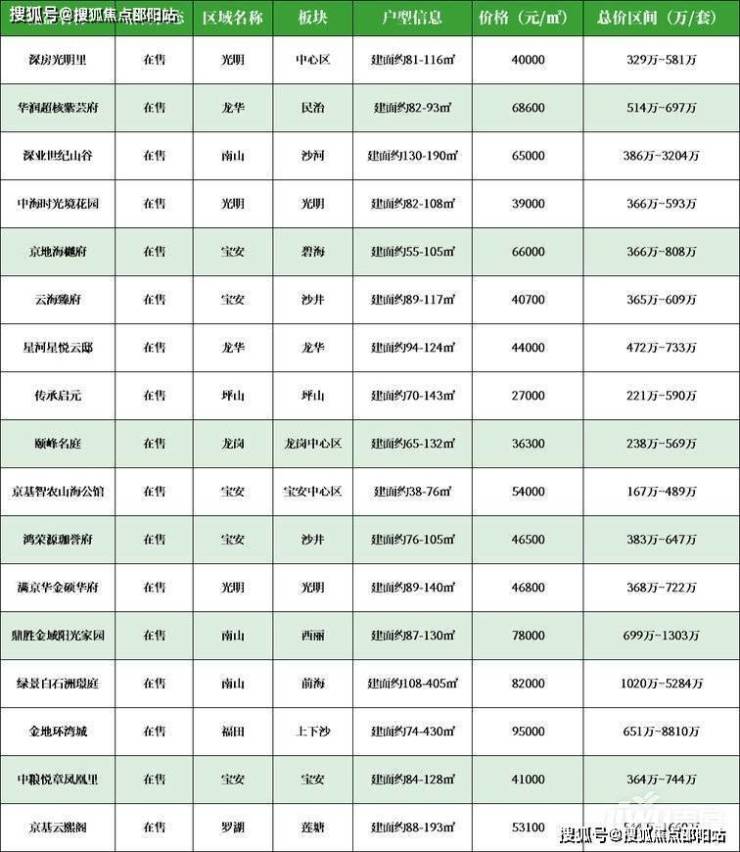 9月深圳新开盘项目共17个,分别为:深房光明里,华润超核紫芸府,深业世纪山谷,中海时光境花园,京地海樾府,云海臻府,星河星悦云邸,传承启元,颐峰名庭,京基智农山海公馆,鸿荣源珈誉府,满京华金硕华府,鼎胜金域阳光家园,绿景白石洲璟庭,金地环湾城,中粮悦章凤凰里,京基云熙阁。