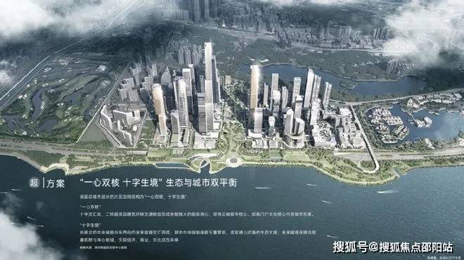 “一心双核”:十字交汇处,三栋高层建筑环绕交通枢纽形成势能强大的超级湾心;深湾云城都市核心、滨海门户文化核心代言城市形象。