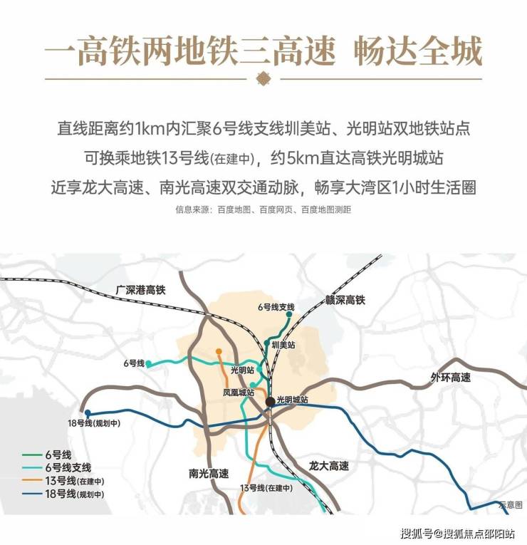 直线距离约1km内汇聚6号线支线圳美站、光明站双地铁站点,可换乘地铁13号线(在建中),约5km直达高铁光明城站,近享龙大高速、南光高速双交通动脉,畅享大湾区1小时生活圈。