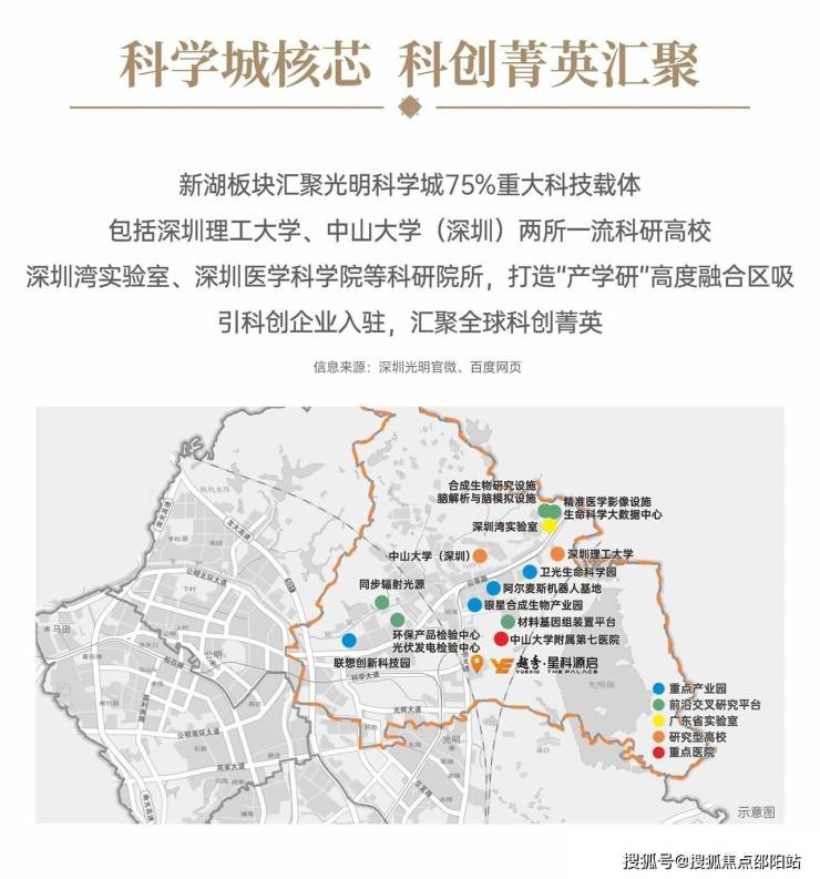 新湖板块汇聚光明科学城75%重大科技载体,包括深圳理工大学、中山大学(深圳)两所一流科研高校,深圳湾实验室、深圳医学科学院等科研院所,打造“产学研”高度融合区,吸引科创企业入驻,汇聚全球科创菁英。