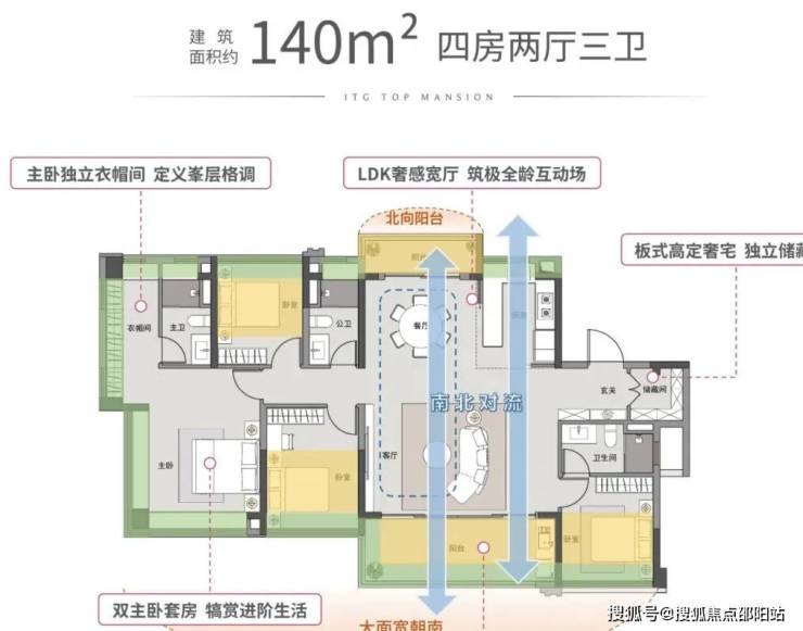 建面140平四房,该户型只有8栋小高层才有,专梯入户,南北对流双阳台的设计,而且还做道双主套的设计,是比较少见的。