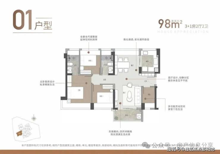 98㎡的4房2厅2卫,仅01户型,设计的是竖厅南北通透格局,进门独立玄关,四开间朝南,U型厨房,客厅阳台东南朝向。