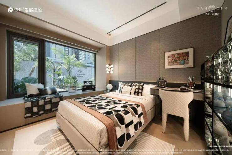 约7.5米超尺寸观景阳台,带来开阔的观景面。31㎡大主套设计,配置270°全景大飘窗,长辈房直出阳台,做到双卧室均可一览开阔视野。