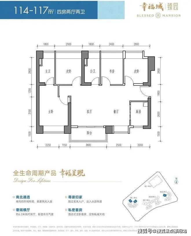 114-117㎡的4房2厅2卫,设计的是横厅南北通透格局,进门入户玄关,客餐厅6.3米开间,LDKB一体化设计,全屋8个飘窗面,4个卧室分别做到了主卧15.35㎡/次卧9.86㎡/次卧9.4㎡/次卧8.16㎡(包含墙体飘窗),U型厨房,卫生间干湿分离,得房率约84.87-87.1%(包含赠送),阳台主朝西南或东南向。