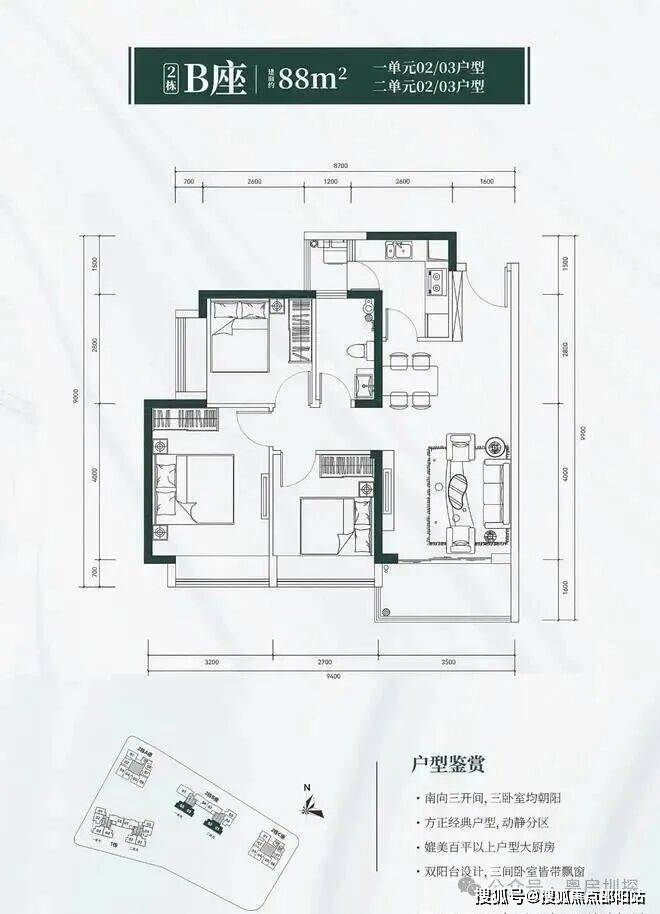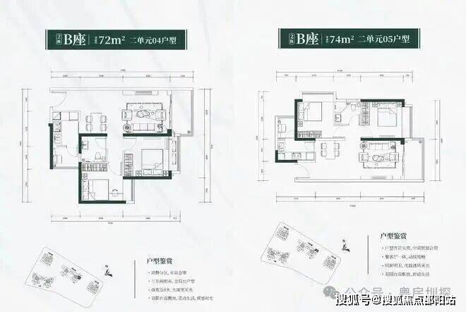 72-74㎡两房两厅一卫(2 栋 B 座二单元 04/05 户型)核心亮点:竖厅格局+全明设计,入户即见L型厨房(带独立生活阳台),客餐厅一体化,进深约7.5米,客厅开间3.2米,搭配2.9米层高,空间通透感强。主卧开间3米,可容纳1.8米床+衣柜;次卧约8-9㎡,适合儿童房或书房,两面采光避免压抑。