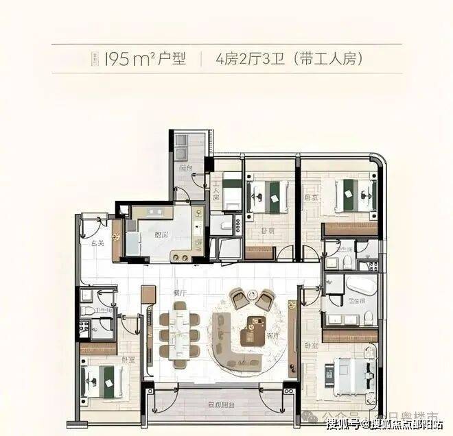 195㎡四房更宽敞,客厅餐厅连在一起,过年亲戚来聚餐都不挤;每个房间都不小,孩子有自己的学习空间,老人住着也舒服。