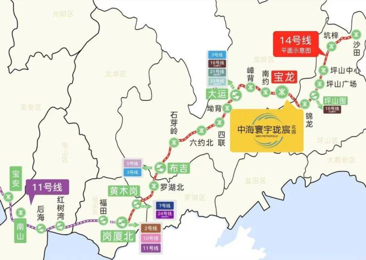 交通配套:14号地铁线“宝龙站”距离约1.4公里,项目配建有公交首末站,可坐公交车直达地铁站,该线路是从坪山沙田开往福田岗夏北的快速线,设计时速120公里,3站到大运,8站到布吉,9站到罗湖,11站到福田岗厦北,用时41分钟。