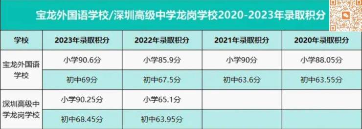 宝龙外国语学校,该校于2018年9月开设办学,是龙城高级中学(教育集团)旗下的九年一贯制公办学校,规划有72个教学班(小学48班,初中24班),可提供优质学位3360个,该校在2023年最新的录取积分,小学90.6分,初中部69分,小学学位如果深户有商品房,基本稳打稳是可以就读的。
