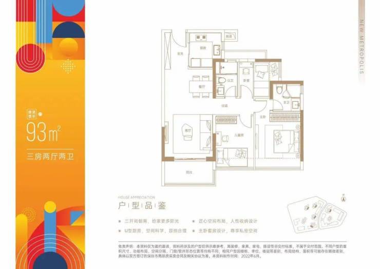 93㎡的3房2厅2卫,价格280-290万左右。设计的是经典竖厅格局,动静分区,客厅3.6米开间,餐客厅一体化,三开间朝南,U型厨房,得房率:86.41%(包含赠送),有西南、东南朝向。