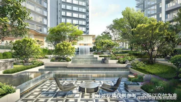 【礼遇二:山水闲庭】:园林中庭设计跌瀑、叠水、山石、树木等自然元素,与中庭水苑、悬浮茶室等空间相互交织,营造典雅森系水院空间;