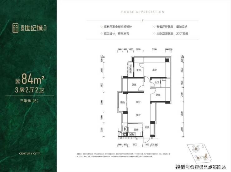 主卧双面飘窗,270°观景