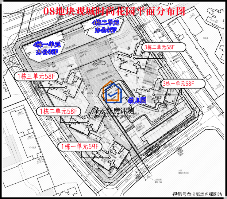 08地块共分3期建设,总占地面积约2.73万㎡,总建筑面积约37.41万㎡,计容建筑面积约27.51万㎡,容积率9.23,绿化率32.01%,共由5栋58-59层高住宅组成,其中1栋1单元住宅59F,1栋2/3单元住宅58F,3栋1单元/2单元住宅58F,4栋1/2单元写字楼35F,2栋是1所18班幼儿园,配建有公交首末站。