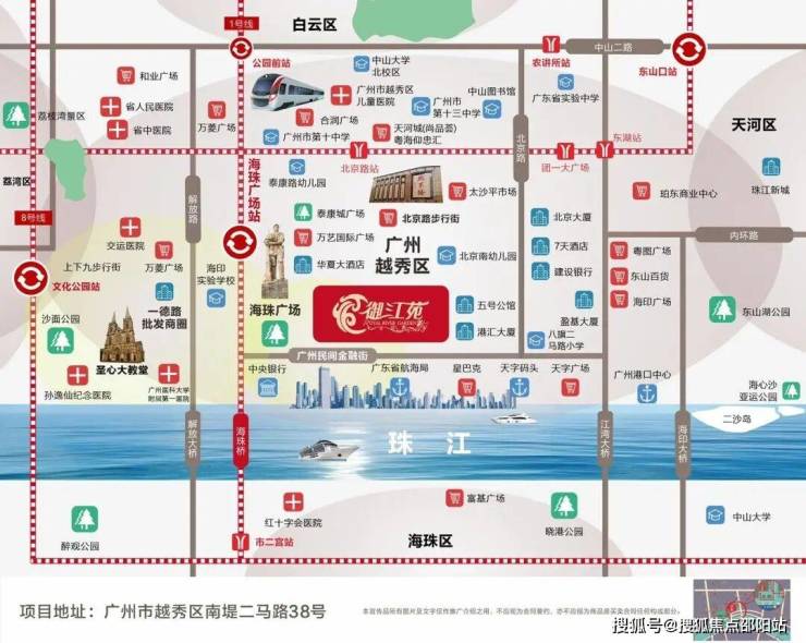 御江苑项目位于南堤二马路西侧,海珠区隔江相望,南 临沿江大道,北临八旗二马路小学小区及太平通津,西侧为广州市第十中学、华侨大厦等,东侧100米即为广州著名文化街区北京路。西、东 面近海珠桥、江湾大桥直通南北,并与天字码头一路相隔。
