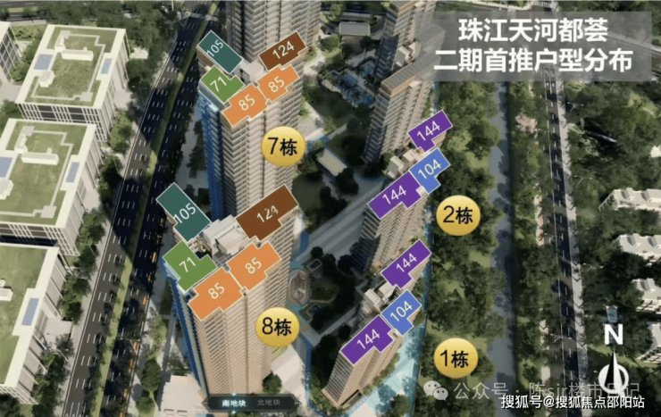 珠江天河都荟,总占地面积5.5万㎡,总计容建面11.56万㎡,分南北两地块开发,首推北地块,容积率2.0,共4栋,货量284套。首推建面约72-152㎡,户户朝南,超宽楼间距。