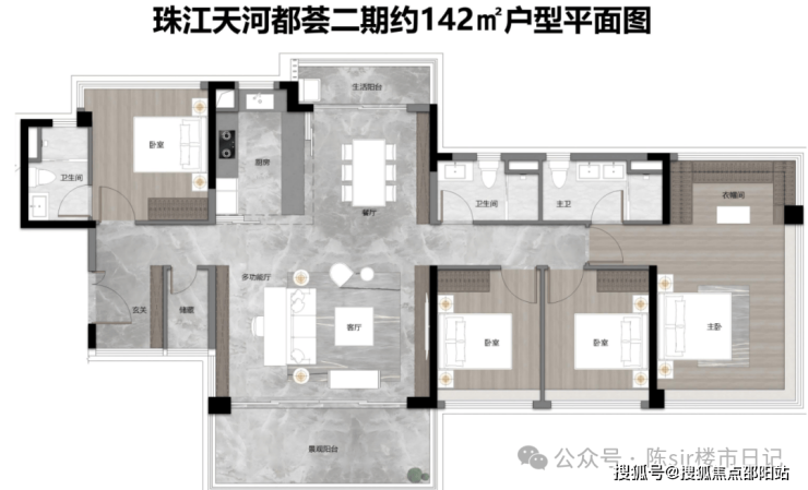 板楼建面约144平4+1房两卫,由原本的152平改造而来,降低总价,减轻买家的压力。