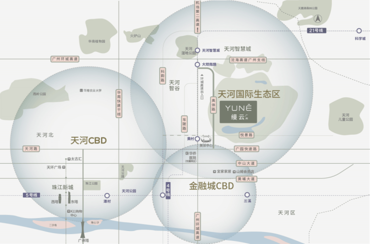 缦云广州择址天河国际生态区核心,与两大经济引擎天河CBD和金融城CBD,保持约6公里的直线距离。