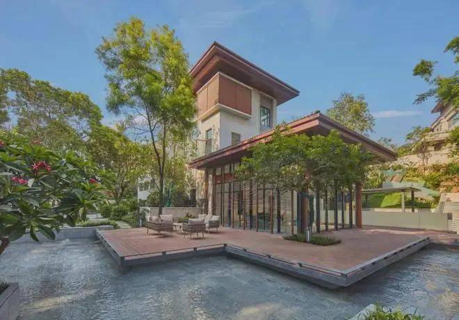 S2「盈水阁」,由设计巨擘赵红红匠心设计,整体设计以泰国普吉岛的独家酒店作为建筑创作蓝本,采用连廊、大桃檐、木制百叶窗、大量水景、泰式尖顶等元素,打造一个“东南亚风情的新现代主义建筑”。同时,根据独特地形地貌,营造出新时代精英阶层寄情山水、崇尚自然、追求静雅的空间场所,倡导“自动尊贵、享受生活”的价值观和新的生活体验。