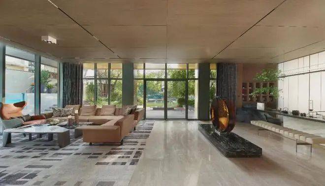 色彩的应用十分讲究,采用了高级灰+琥珀金,神秘大方,柔和华贵;配饰的应用,用心至极,摆放时无比苛刻,力求打造最佳展示效果;玄关处放置了一块黑曜石,黑曜石低调神秘的特质衬托出空间的奢华感;花艺装置更是采用了亚洲顶级花艺大师凌宗涌的作品;客厅的沙发原型则由法拉利首席设计师合作设计既酷炫又有科技感。