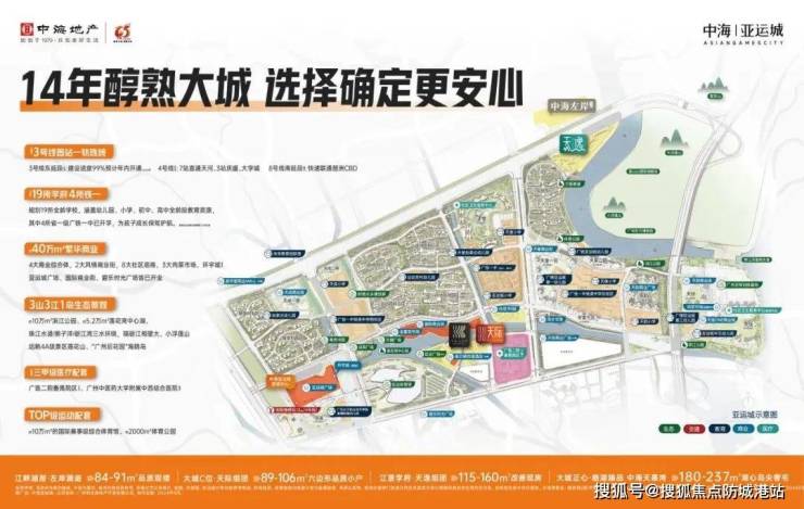 中海天幕湾所在的亚运城区域商圈林立,全球顶级配套 3.0 即将兑现。亚运城整体规划有约 40 万平方米的商业空间,相当于 10 个天河城的规模,包括 4 个大型商业综合体、2 个风情喜街、7 个商业街区和 3 个肉菜综合市场。目前已有约 6 万平方米的亚运城广场、3 万平方米的喜街和 4 万平方米的碧乐时光广场开业。