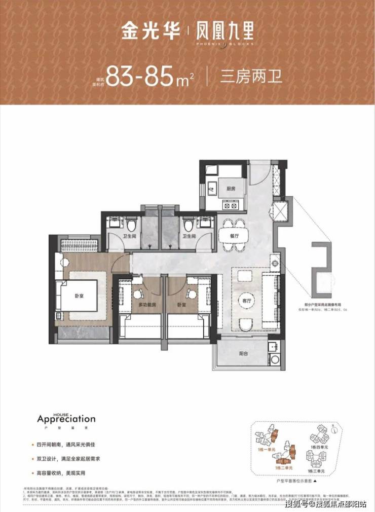 金光华凤凰九里开盘时间为2023年11月,推出1栋1/3单元,共430套房源,面积68-106㎡,2-4房,金光华凤凰九里得房率达到80%,加上赠送面积约90%,还是很不错的,目前在售产品折后总价区间,67m²2房1卫:215-238万,74m²3房1卫:230-259万,85m²3房2卫:270-318万,106m²4房2卫:350-425万,67平米两房0首付5万定金即可上车,月供30年8900左右每个月!74平米0首付定金5万三房月供9800上车