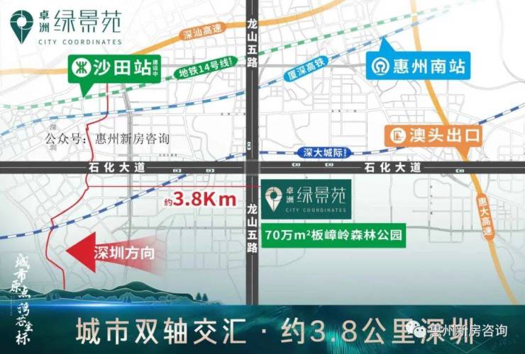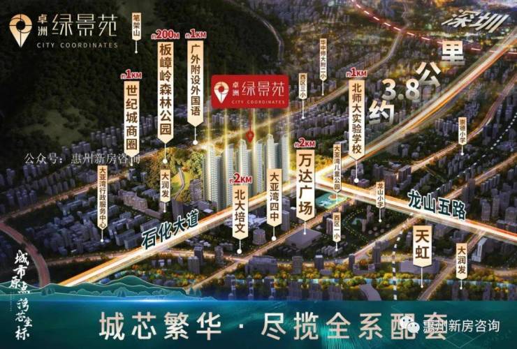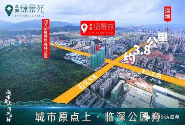 卓洲·绿景苑位于城市双核心命脉,石化大道与龙山五路交汇处,约3.8公里直线深圳。约200米70万方板嶂岭森林公园。项目由3栋高层组成,科学化一字排布,百米阳光楼间距,品鉴城市繁华绿景