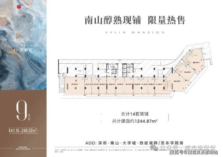 9栋M层为14套商铺,共计1244.87 ㎡;其中01-02-03铺为挑高铺; 整体为2层铺;