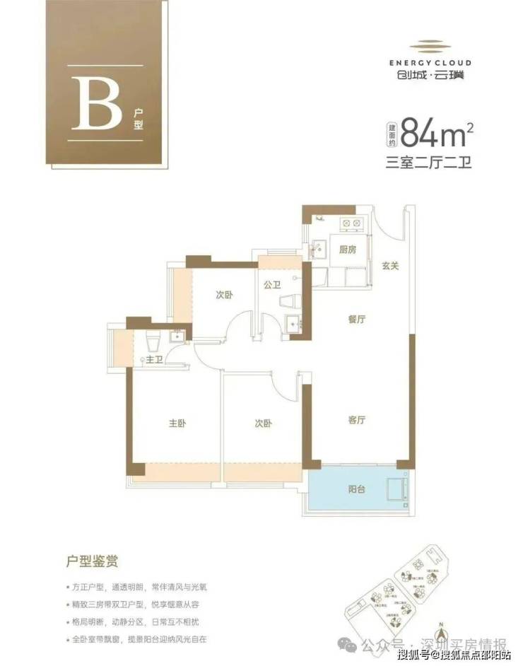 -84㎡3房2厅2卫:设计的是竖厅格局,LDKB一体化设计,客厅3.4米开间,U型厨房,卫生间干湿分离,阳台有正东、西北、东北、东南、西南朝向。