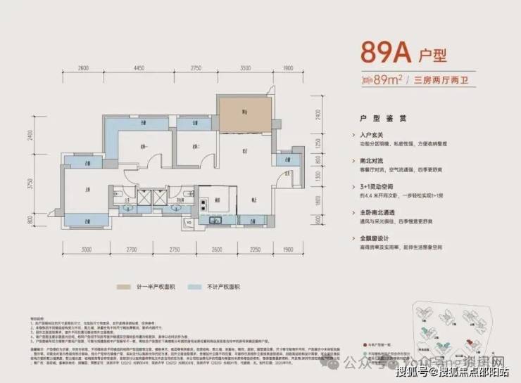 入户处比较宽敞,可以做鞋柜收纳,客餐厅南北对流,全飘窗设计,高得房率及使用率,主卧南北通透,通风和采光不错,套房设计,其中一个次卧可以改成1+1房。