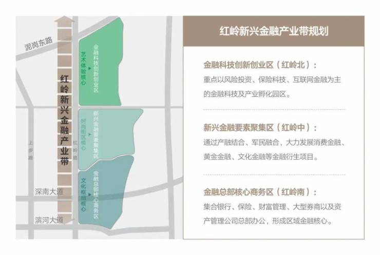 红岭新兴金融产业带,着力构建 具有世界级竞争力的现代产业体系 , 依托片区约超过20个产业园区、地标项目,城市更新项目等重点项目有力推进建设,集打造 集金融科技、新兴金融、金融总部于一体的粤港澳大湾区金融服务中心 。