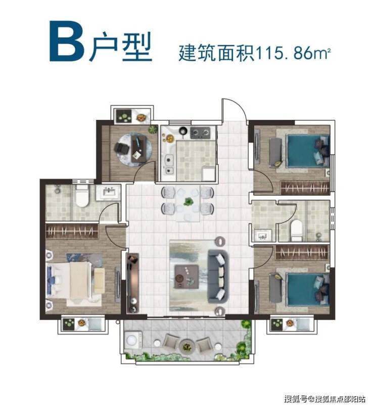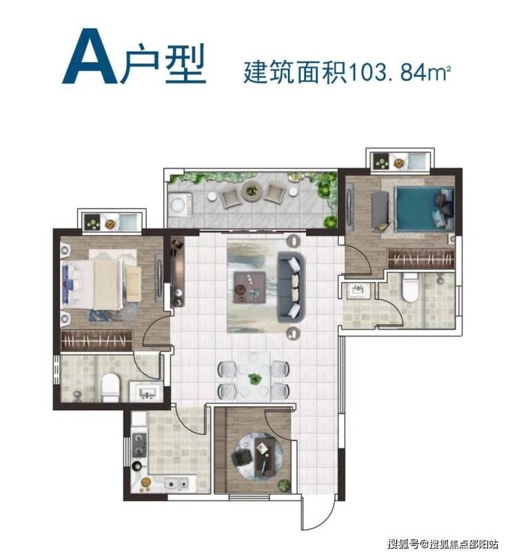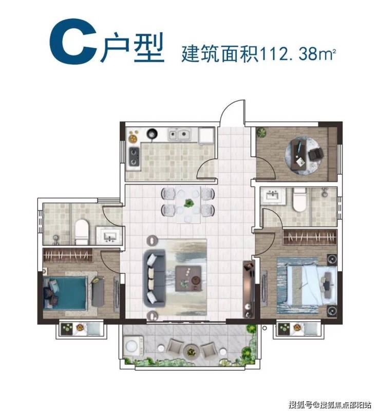 户型分为A型103.84㎡、B型115.86㎡、C型112.38㎡,三种户型。