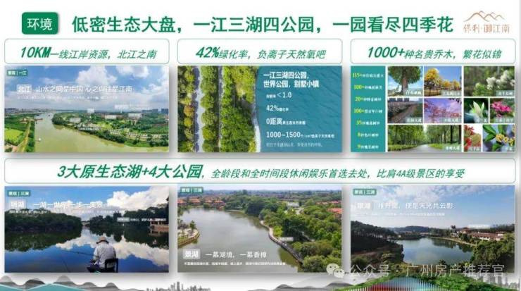 斥资20 亿重金打造“1 江 3 湖 4 公园”的大园林景观:10 里的北江景观资源,三大原生态湖泊,邻近销售中心的 2.8 万㎡景湖;紧邻江南汇酒店 2 万㎡的翠湖;还有面积最大 21 万㎡的明湖;围绕明湖,还建有一个明湖公园,里面有一条 3 公里的环湖自行车道。