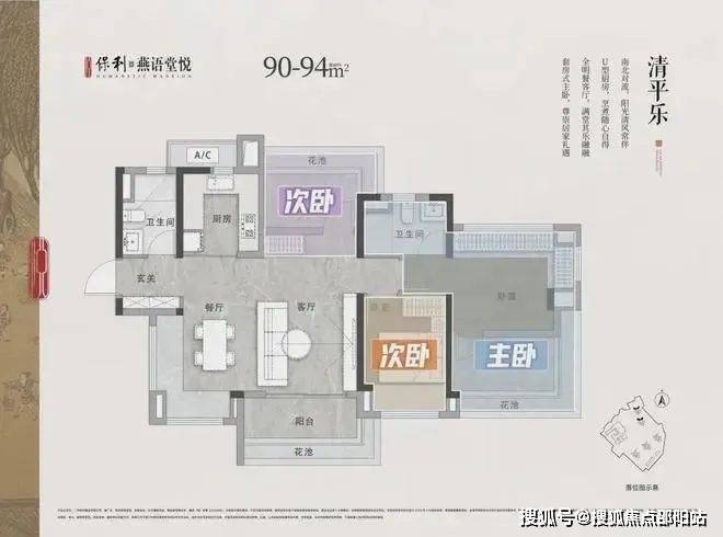 主打90-125㎡中式超高层产品,部分小高层户型达120-140㎡。所有户型均为南向设计,实用率超100%,客餐厅带飘窗,主套带U型飘窗,采光通风好且空间利用率高。