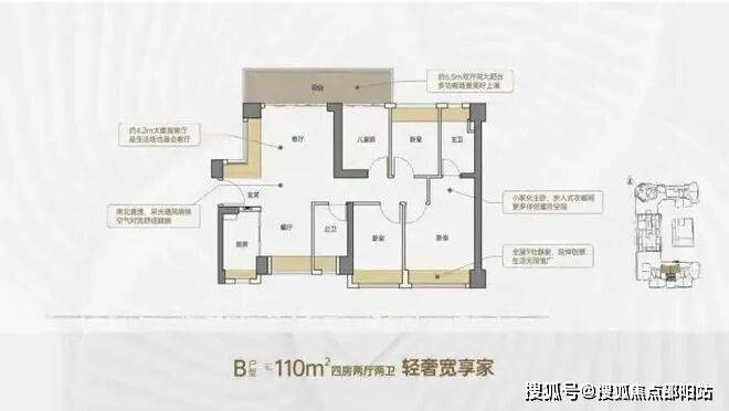 110㎡的4房2厅2卫,设计的是竖厅南北通透格局,客厅4.2米开间,进门户玄关,客厅连接次卧出6.5米长的大阳台,主卧大套间设计,全屋9处飘窗,U型厨房,卫生间干湿分离,阳台主朝北向。